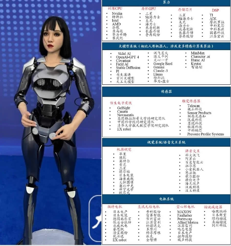 外觀設(shè)計(jì):3D打印骨骼與硅膠仿真皮技術(shù)使機(jī)器人外表和觸感都接近 真人;柔性關(guān)節(jié)技術(shù),滿(mǎn)足人形機(jī)器人小型化、參數(shù)可定制、大扭矩等特殊 需求,提升了機(jī)器人動(dòng)作的柔順度。
